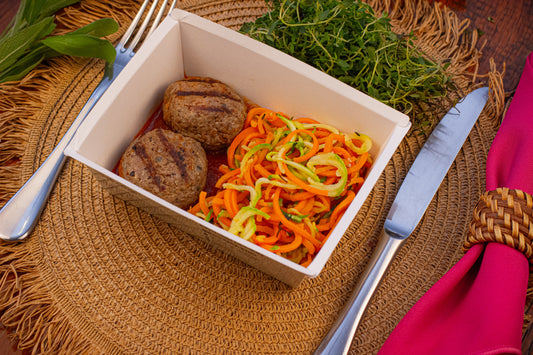 Polpetone Recheado de Queijo ao Sugo c/ Espaguete de Legumes