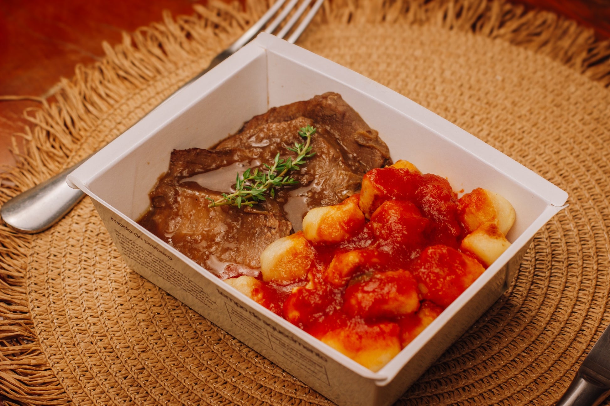 Carne Assada ao Molho Demi-Glace c/ Nhoque de Batatas ao Sugo