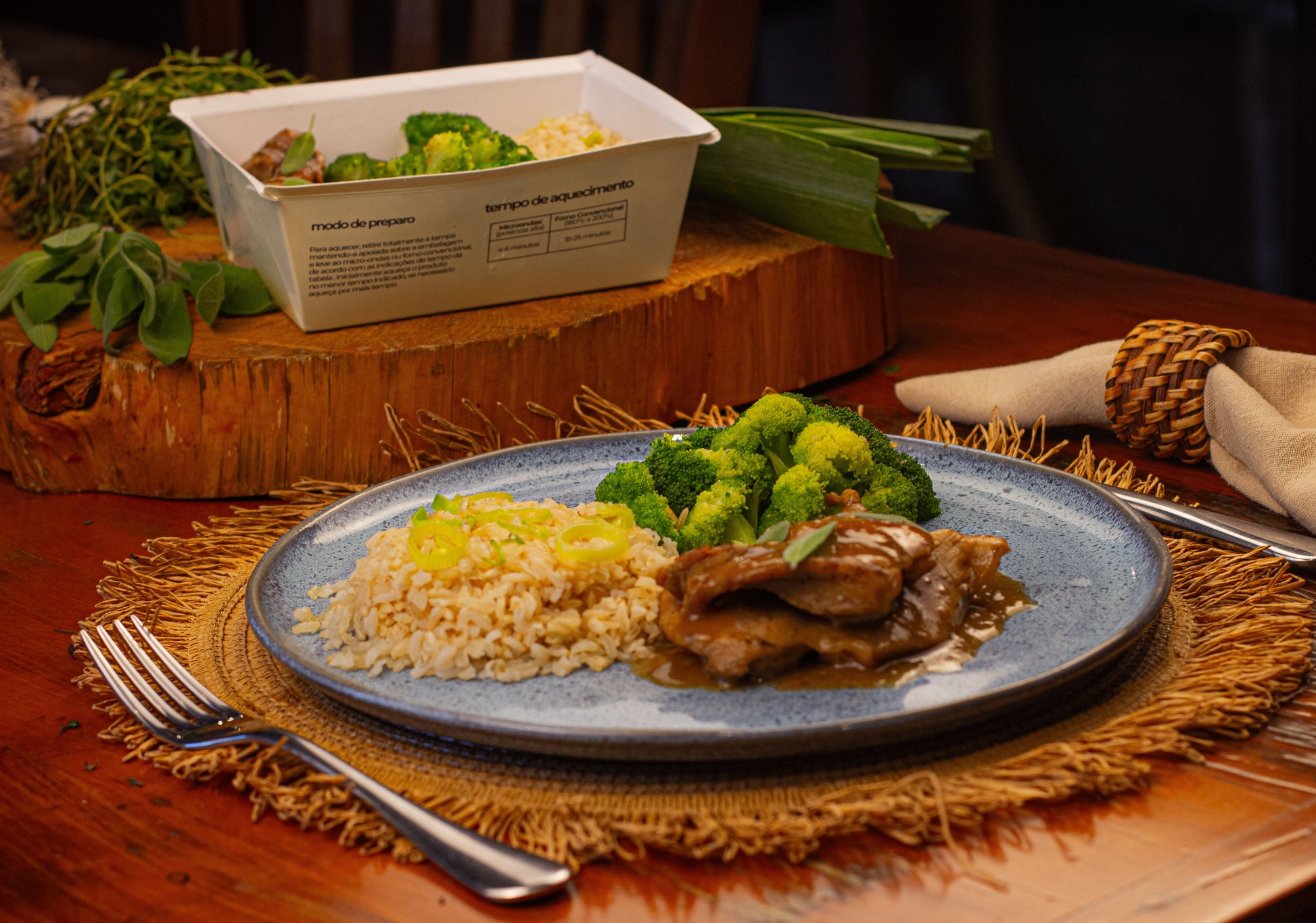 O filé de coxa de frango é grelhado e finalizado com um delicado molho de sálvia, que realça o sabor da carne com um toque herbal. Acompanhado de um arroz integral aromatizado com alho-poró e brócolis salteados no alho, essa combinação entrega equilíbrio, textura e muito sabor.