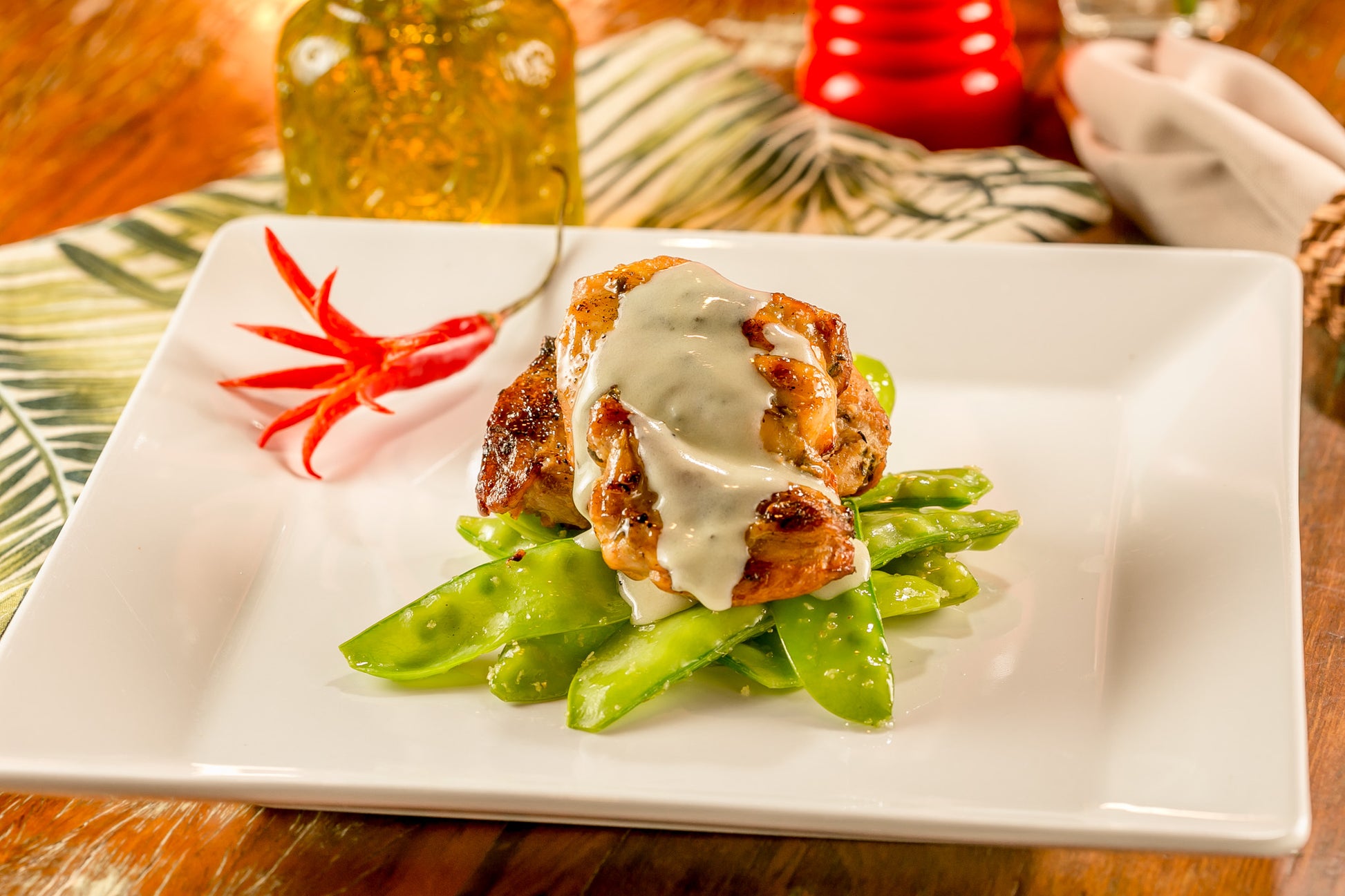 Filé de Coxa ao Molho Gorgonzola c/ Ervilha Torta